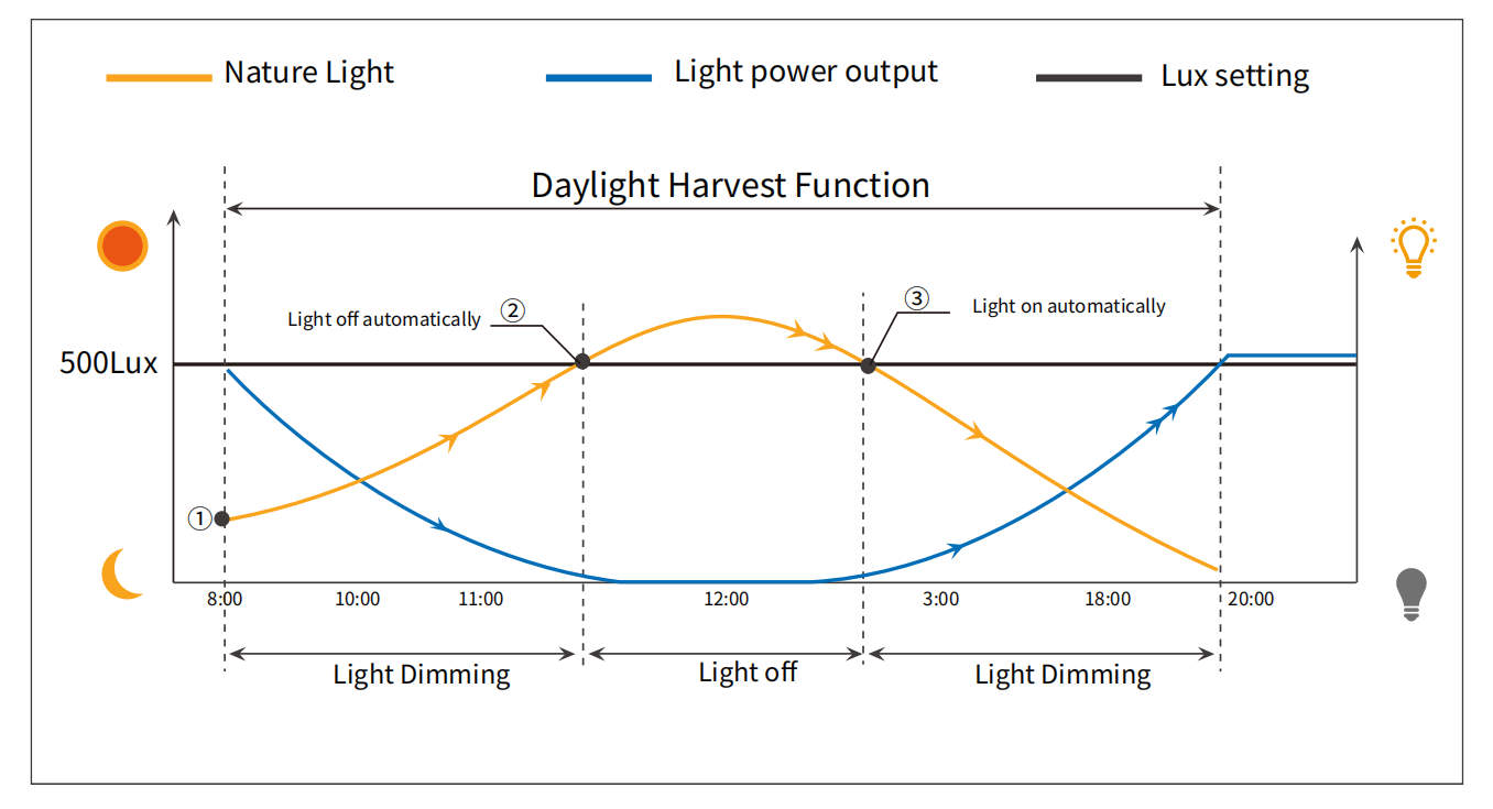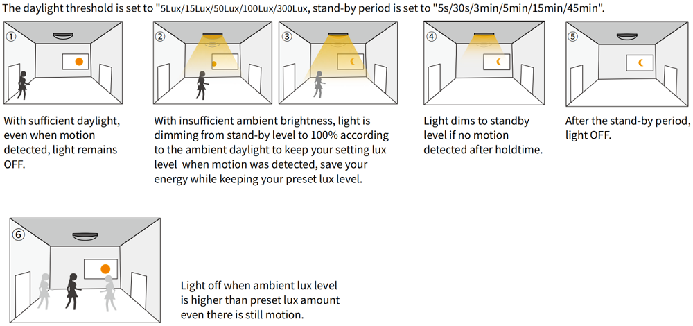 Када сензор открије природно светло, он ће пригушити светло, светлосна јединица затамњује излаз као што је доле: